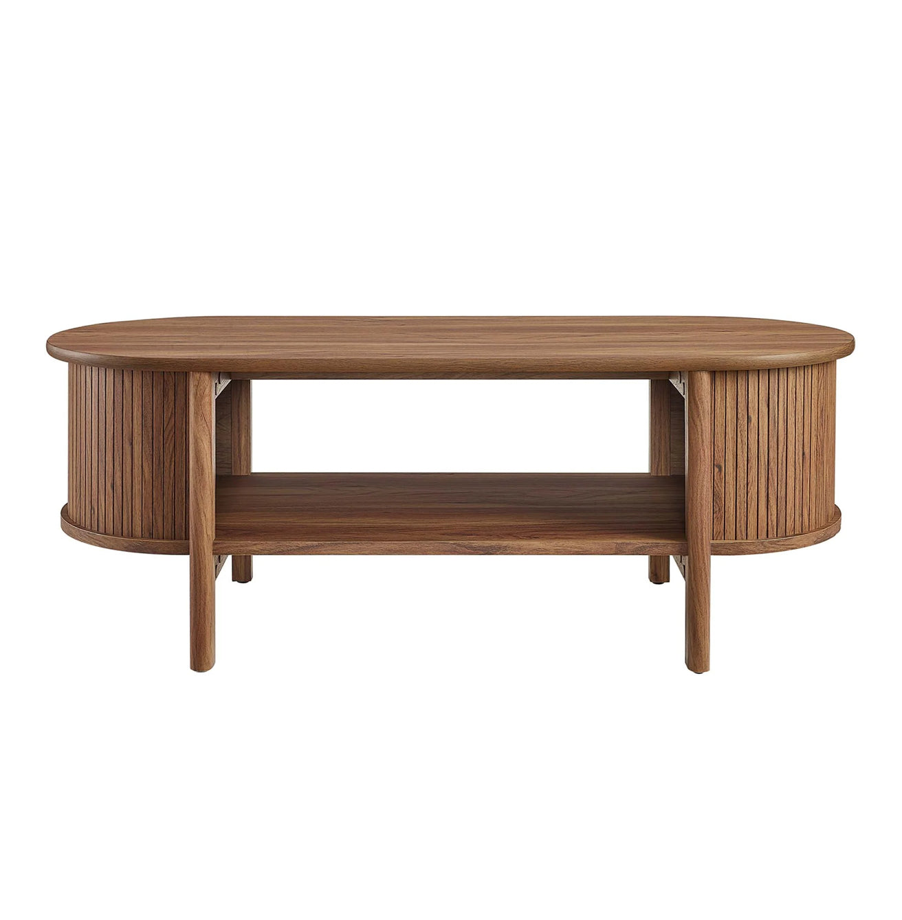 Con un diseño inspirado en el estilo mid-century modern, la mesa de centro Cadence aporta funcionalidad y elegancia a cualquier sala de estar. Su distintiva silueta ovalada con bordes curvados y detalles acanalados realza la estética del espacio, mientras que su estructura de madera de caucho, MDF y aglomerado garantiza durabilidad. La superficie laminada con vetas de madera añade un toque orgánico, ideal para exhibir libros, decoración o bebidas. Cuenta con un estante abierto inferior para almacenamiento adicional y deslizadores ajustables que protegen el suelo y brindan estabilidad.